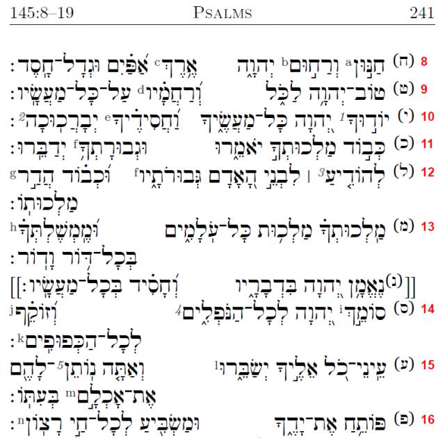 I have just updated my Psalms Hebrew reader (available here). While the base text in the book is the one found in the Leningrad Codex and hence BHS, I have made one very slight amendment. I used the update as an opportunity to reinsert a line that has dropped out of Hebrew Bibles for two thousand years. In Psalm 145:13 I reintroduced the missing נ-nun stanza from the acrostic in [‎[double square brackets]‎]. The dropped stanza sticks out in the Masoretic Text since all other verses in the Psalm being with the sequential letters of the Hebrew alphabet (א–ת). The line is almost certainly original given its occurrence in the Greek Septuagint and Dead Sea Scrolls: